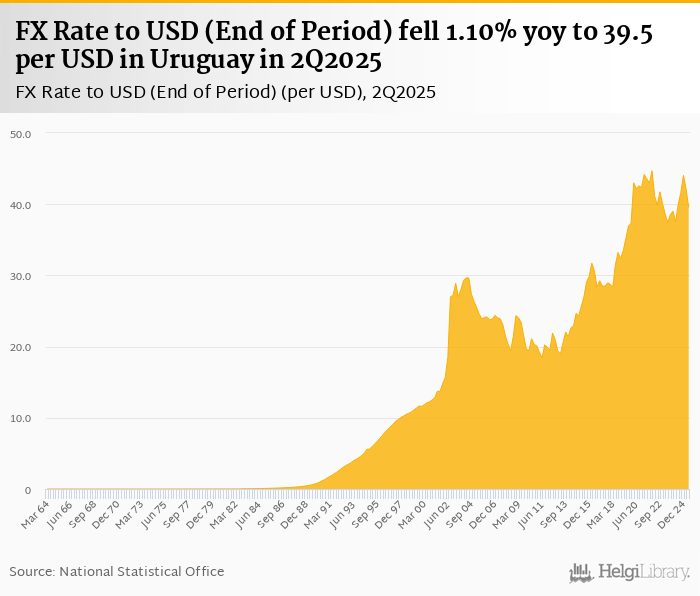 FX rate to USD at the end of period fell 1.10% yoy to 39.5 per USD in Uruguay in 2Q2025, according to the National Statistical Office. This is 6.12% less than in the previous quarter.