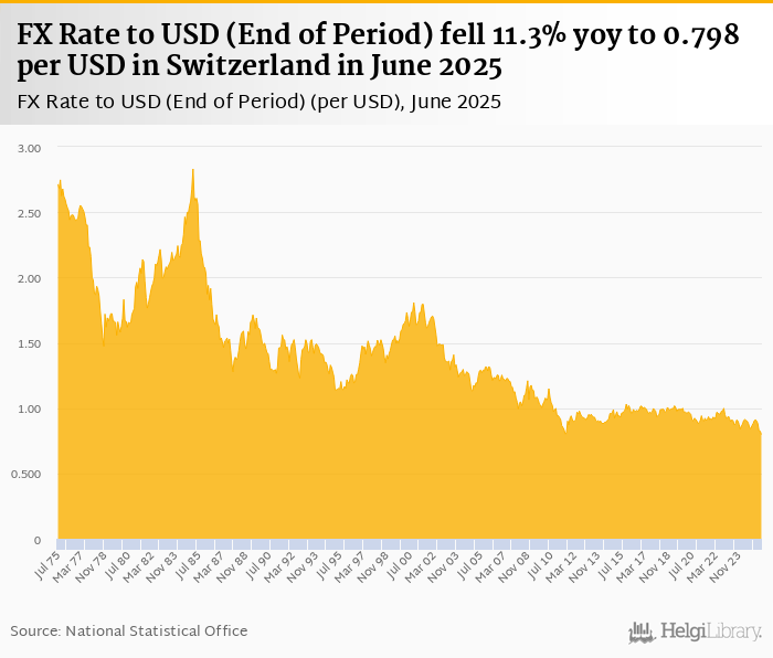 FX rate to USD at the end of period fell 11.3% yoy to 0.798 per USD in Switzerland in June 2025, according to the National Statistical Office. This is 3.19% less than in the previous month.