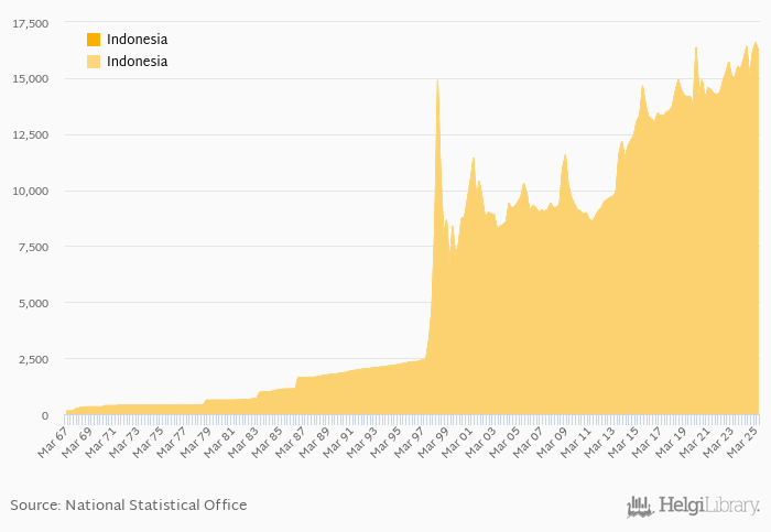 Historically, FX rate to USD at the end of period in Indonesia reached an all time high of 16,588 per USD in 1Q2025 and an all time low of 137 per USD in 1Q1967. When compared to Indonesia's main peers, FX rate to USD at the end of period in Australia amounted to 1.53 per USD, 4.22 per USD in Malaysia, 56.6 per USD in Philippines and 1.28 per USD in Singapore in 2Q2025.