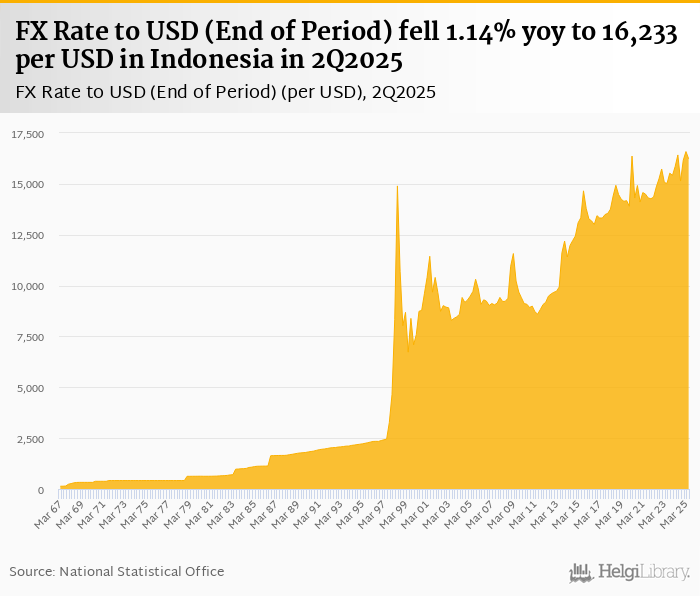 FX rate to USD at the end of period fell 1.14% yoy to 16,233 per USD in Indonesia in 2Q2025, according to the National Statistical Office. This is 2.14% less than in the previous quarter.
