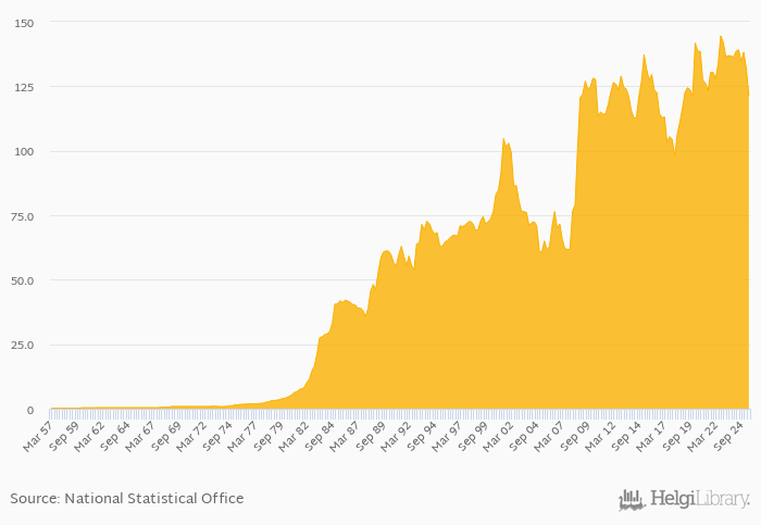 Historically, FX rate to USD at the end of period in Iceland reached an all time high of 145 per USD in 3Q2022 and an all time low of 0.163 per USD in 1Q1957. When compared to Iceland's main peers, FX rate to USD at the end of period in Denmark amounted to 6.37 per USD, 10.1 per USD in Norway, 9.51 per USD in Sweden and 0.730 per USD in United Kingdom in 2Q2025.