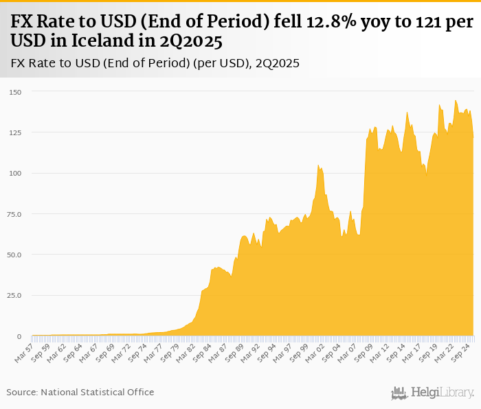 FX rate to USD at the end of period fell 12.8% yoy to 121 per USD in Iceland in 2Q2025, according to the National Statistical Office. This is 8.05% less than in the previous quarter.
