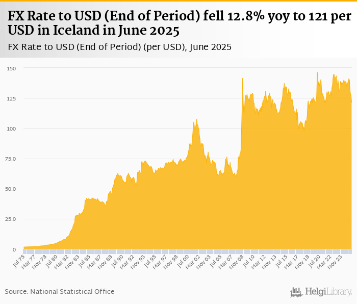 FX rate to USD at the end of period fell 12.8% yoy to 121 per USD in Iceland in June 2025, according to the National Statistical Office. This is 4.59% less than in the previous month.