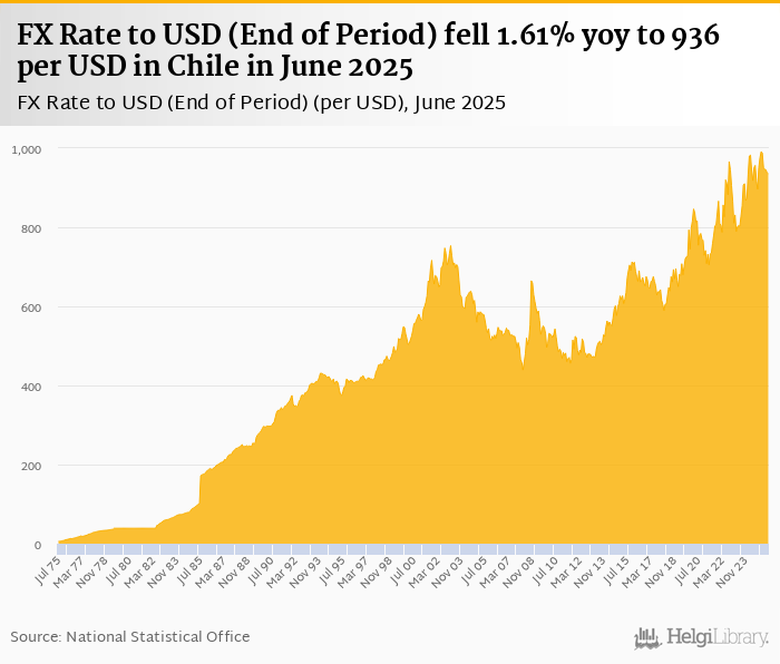 FX rate to USD at the end of period fell 1.61% yoy to 936 per USD in Chile in June 2025, according to the National Statistical Office. This is 0.174% less than in the previous month.