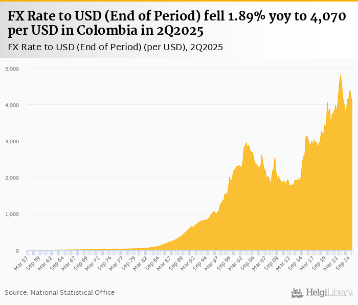 FX rate to USD at the end of period fell 1.89% yoy to 4,070 per USD in Colombia in 2Q2025, according to the National Statistical Office. This is 2.93% less than in the previous quarter.