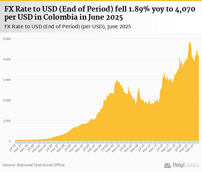 FX rate to USD at the end of period fell 1.89% yoy to 4,070 per USD in Colombia in June 2025, according to the National Statistical Office. This is 1.91% less than in the previous month.