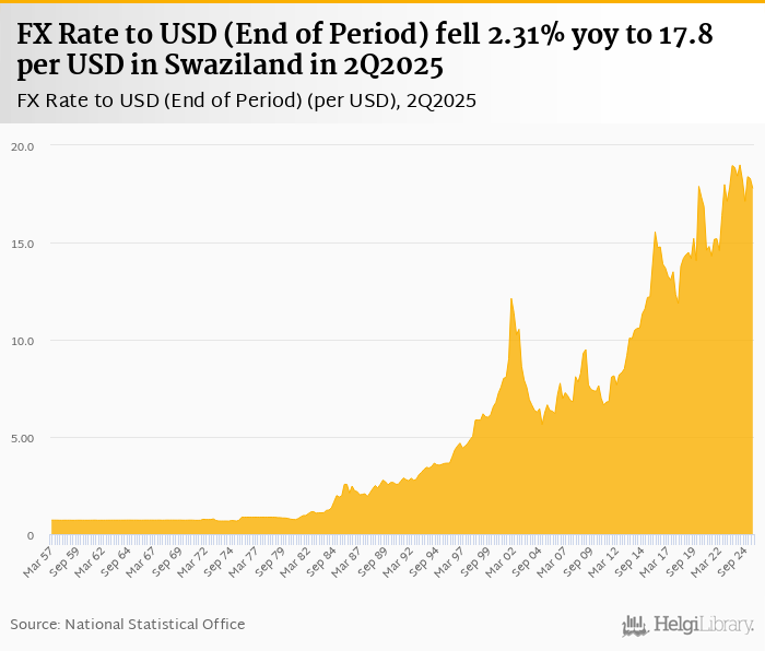 FX rate to USD at the end of period fell 2.31% yoy to 17.8 per USD in Swaziland in 2Q2025, according to the National Statistical Office. This is 2.81% less than in the previous quarter.
