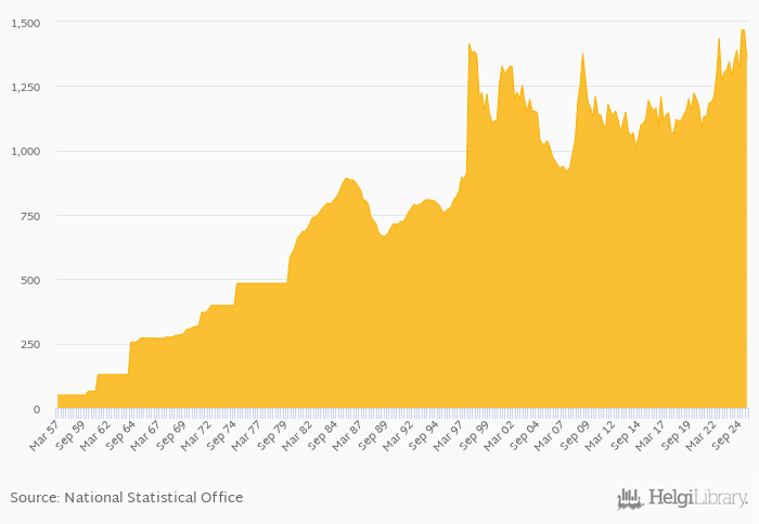 Historically, FX rate to USD at the end of period in South Korea reached an all time high of 1,470 per USD in 4Q2024 and an all time low of 50.0 per USD in 1Q1957.