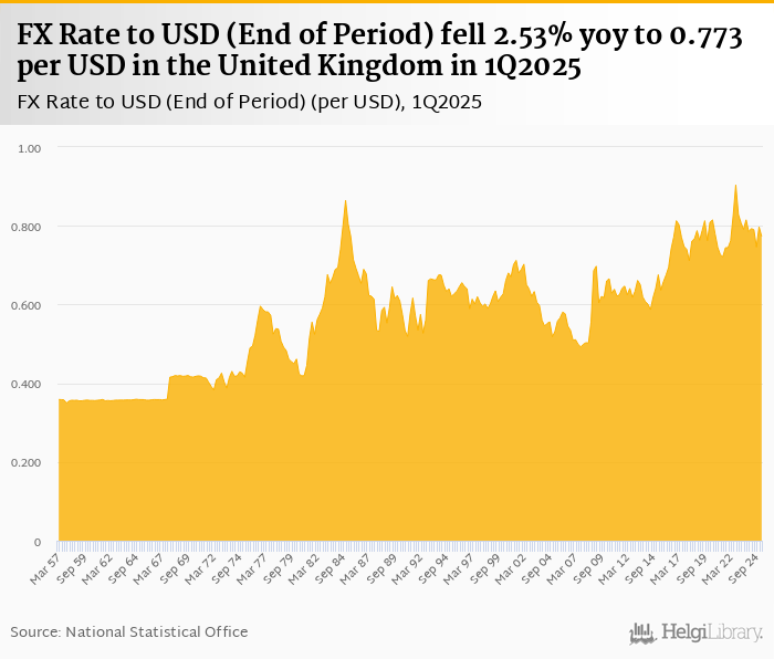 FX Rate to USD (End of Period) fell 2.53% yoy to 0.773 per USD in the United Kingdom in 1Q2025