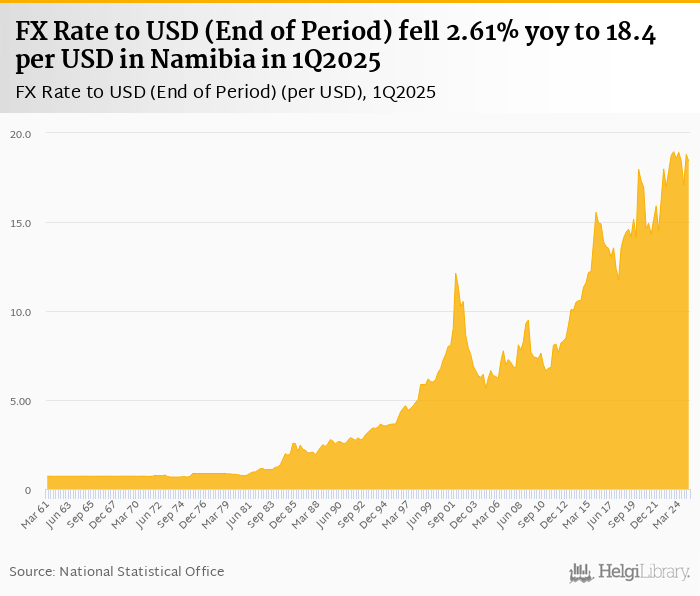 FX rate to USD at the end of period fell 2.61% yoy to 18.4 per USD in Namibia in 1Q2025, according to the National Statistical Office. This is 2.01% less than in the previous quarter.