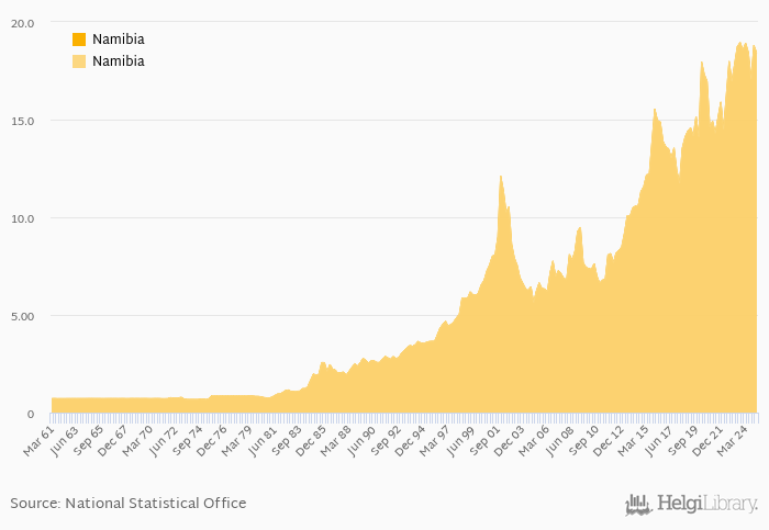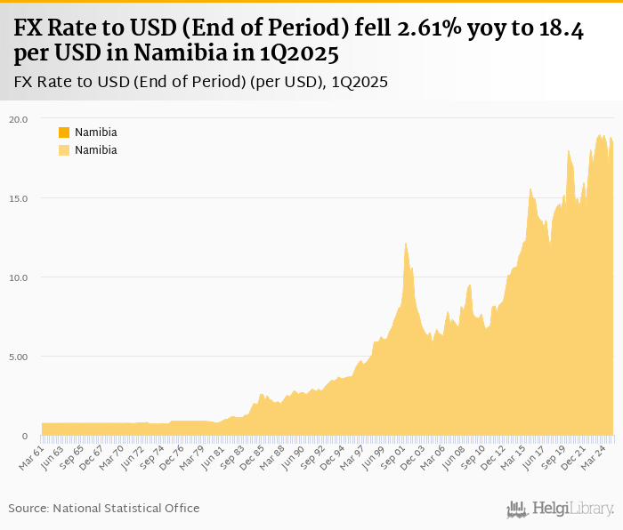 FX rate to USD at the end of period fell 2.61% yoy to 18.4 per USD in Namibia in 1Q2025, according to the National Statistical Office. This is 2.01% less than in the previous quarter.