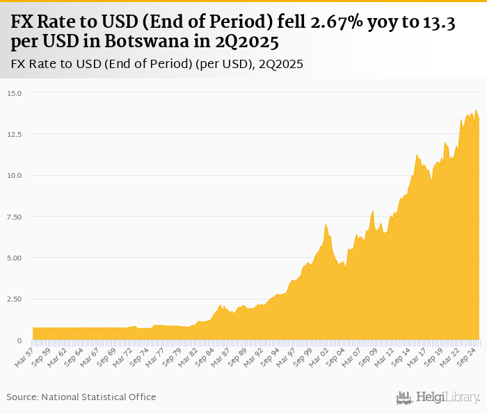 FX rate to USD at the end of period fell 2.67% yoy to 13.3 per USD in Botswana in 2Q2025, according to the National Statistical Office. This is 2.70% less than in the previous quarter.