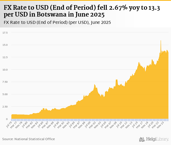 FX rate to USD at the end of period fell 2.67% yoy to 13.3 per USD in Botswana in June 2025, according to the National Statistical Office. This is 0.802% less than in the previous month.