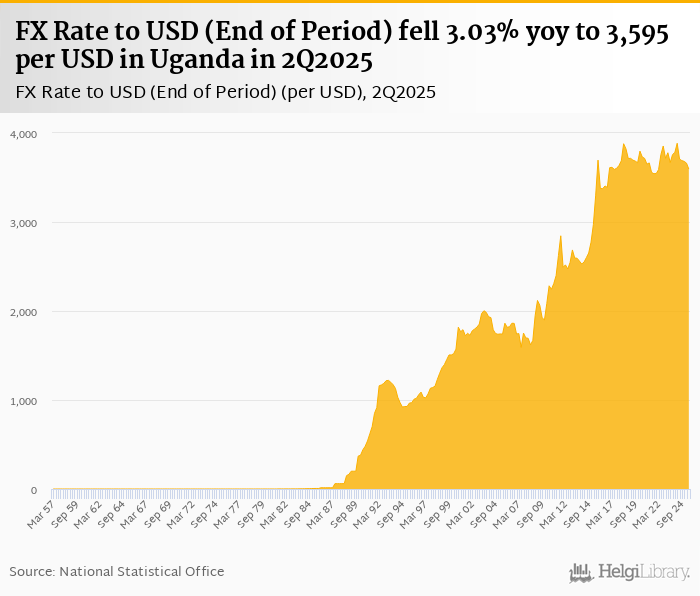 FX rate to USD at the end of period fell 3.03% yoy to 3,595 per USD in Uganda in 2Q2025, according to the National Statistical Office. This is 1.83% less than in the previous quarter.