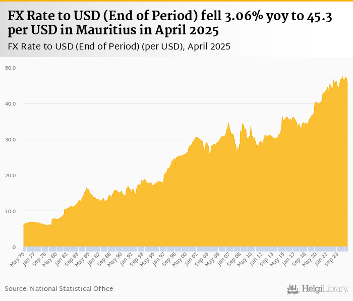 FX rate to USD at the end of period fell 3.06% yoy to 45.3 per USD in Mauritius in April 2025, according to the National Statistical Office. This is 1.04% less than in the previous month.