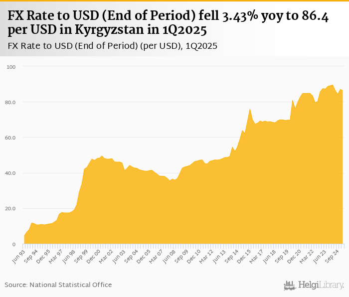 FX rate to USD at the end of period fell 3.43% yoy to 86.4 per USD in Kyrgyzstan in 1Q2025, according to the National Statistical Office. This is 0.690% less than in the previous quarter.