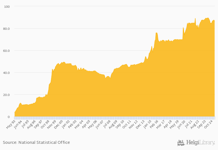 Historically, FX rate to USD at the end of period in Kyrgyzstan reached an all time high of 89.5 per USD in March 2024 and an all time low of 3.80 per USD in May 1993. When compared to Kyrgyzstan's main peers, FX rate to USD at the end of period in China amounted to 7.25 per USD, 504 per USD in Kazakhstan, 10.9 per USD in Tajikistan and 12,913 per USD in Uzbekistan in March 2025.