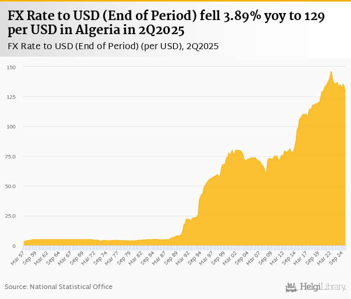 FX rate to USD at the end of period fell 3.89% yoy to 129 per USD in Algeria in 2Q2025, according to the National Statistical Office. This is 3.25% less than in the previous quarter.