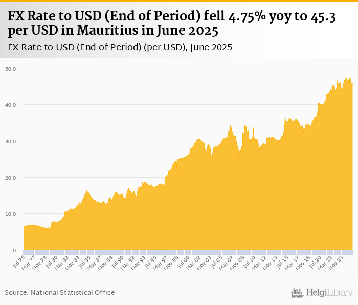 FX rate to USD at the end of period fell 4.75% yoy to 45.3 per USD in Mauritius in June 2025, according to the National Statistical Office. This is 1.34% less than in the previous month.