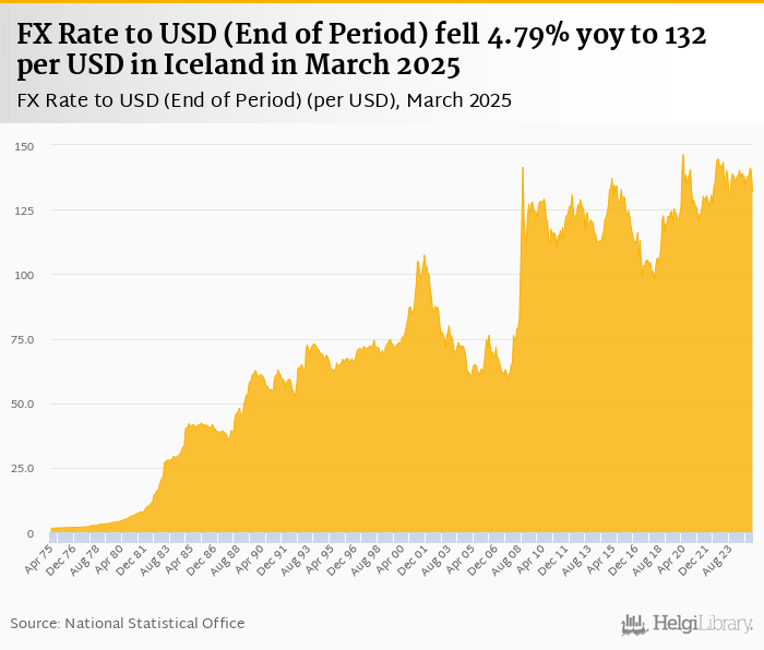 FX rate to USD at the end of period fell 4.79% yoy to 132 per USD in Iceland in March 2025, according to the National Statistical Office. This is 5.72% less than in the previous month.