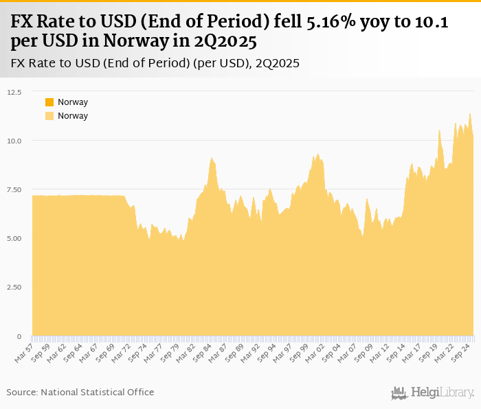 FX rate to USD at the end of period fell 5.16% yoy to 10.1 per USD in Norway in 2Q2025, according to the National Statistical Office. This is 4.27% less than in the previous quarter.