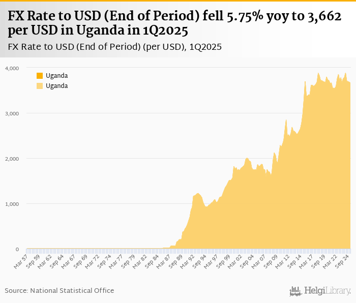 FX rate to USD at the end of period fell 5.75% yoy to 3,662 per USD in Uganda in 1Q2025, according to the National Statistical Office. This is 0.530% less than in the previous quarter.