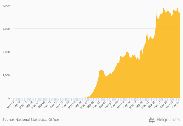 FX rate to USD at the end of period fell 5.75% yoy to 3,662 per USD in Uganda in 1Q2025, according to the National Statistical Office. This is 0.530% less than in the previous quarter.