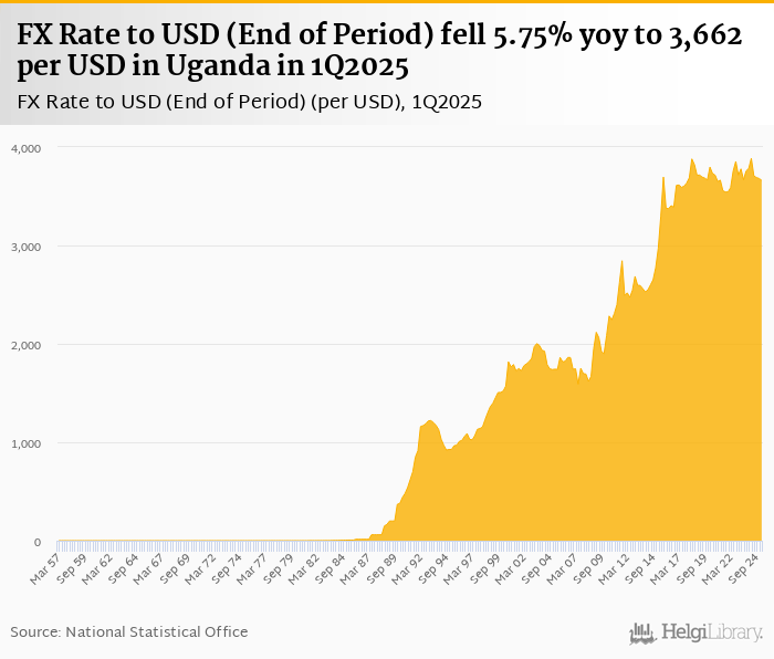 FX Rate to USD (End of Period) fell 5.75% yoy to 3,662 per USD in Uganda in 1Q2025