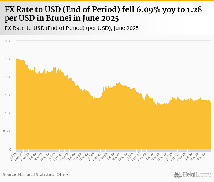 FX rate to USD at the end of period fell 6.09% yoy to 1.28 per USD in Brunei in June 2025, according to the National Statistical Office. This is 0.986% less than in the previous month.