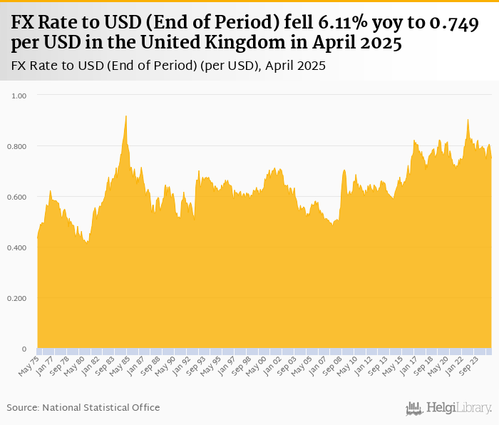 FX rate to USD at the end of period fell 6.11% yoy to 0.749 per USD in the United Kingdom in April 2025, according to the National Statistical Office. This is 3.13% less than in the previous month.