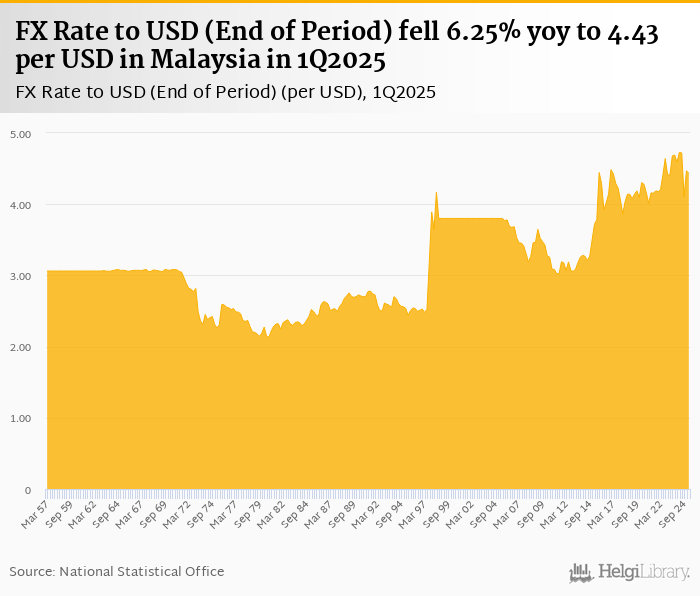 FX Rate to USD (End of Period) fell 6.25% yoy to 4.43 per USD in Malaysia in 1Q2025