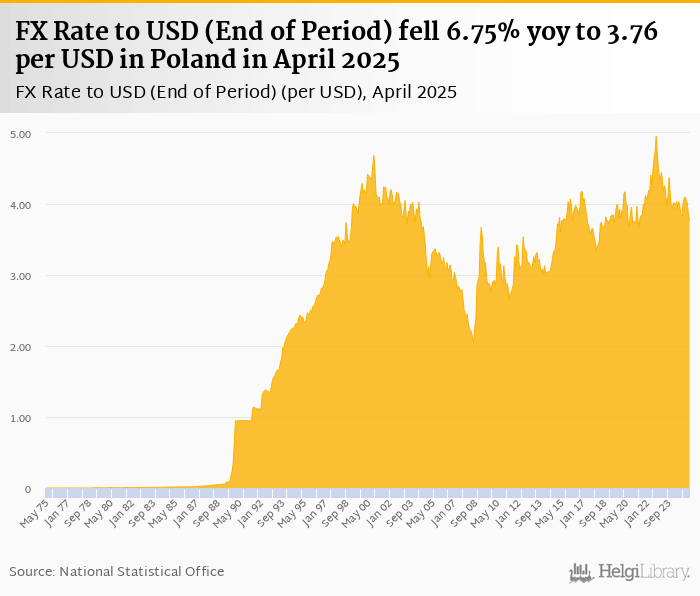FX rate to USD at the end of period fell 6.75% yoy to 3.76 per USD in Poland in April 2025, according to the National Statistical Office. This is 2.66% less than in the previous month.