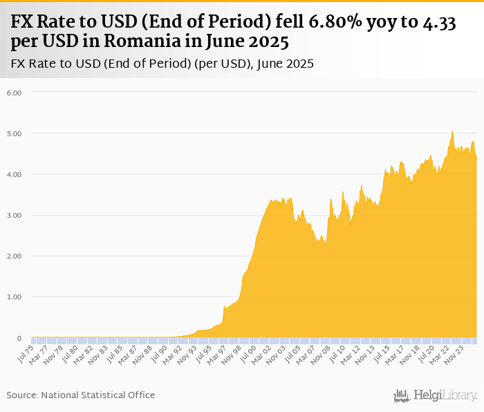 FX rate to USD at the end of period fell 6.80% yoy to 4.33 per USD in Romania in June 2025, according to the National Statistical Office. This is 3.06% less than in the previous month.