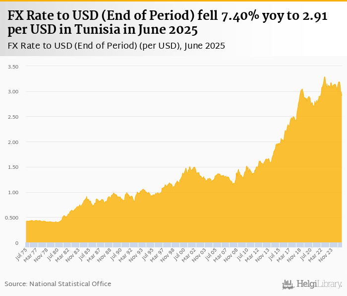 FX rate to USD at the end of period fell 7.40% yoy to 2.91 per USD in Tunisia in June 2025, according to the National Statistical Office. This is 2.55% less than in the previous month.
