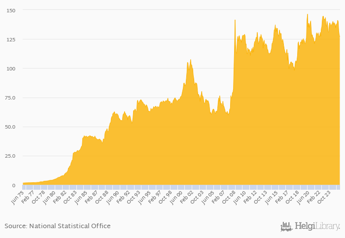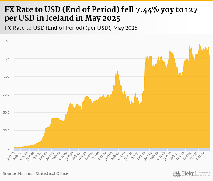 FX rate to USD at the end of period fell 7.44% yoy to 127 per USD in Iceland in May 2025, according to the National Statistical Office. This is 0.873% less than in the previous month.