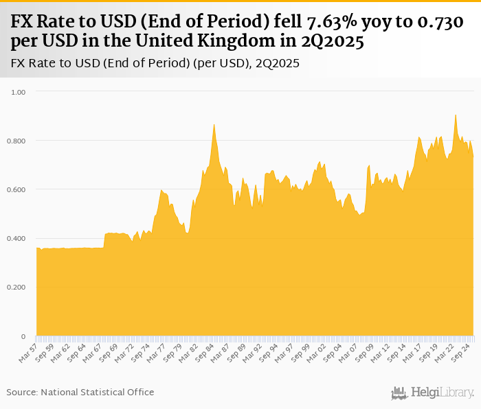 FX rate to USD at the end of period fell 7.63% yoy to 0.730 per USD in the United Kingdom in 2Q2025, according to the National Statistical Office. This is 5.57% less than in the previous quarter.
