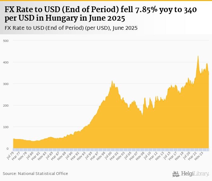 FX rate to USD at the end of period fell 7.85% yoy to 340 per USD in Hungary in June 2025, according to the National Statistical Office. This is 4.60% less than in the previous month.