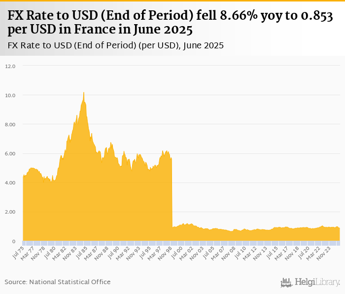 FX rate to USD at the end of period fell 8.66% yoy to 0.853 per USD in France in June 2025, according to the National Statistical Office. This is 3.25% less than in the previous month.