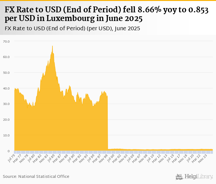 FX rate to USD at the end of period fell 8.66% yoy to 0.853 per USD in Luxembourg in June 2025, according to the National Statistical Office. This is 3.25% less than in the previous month.