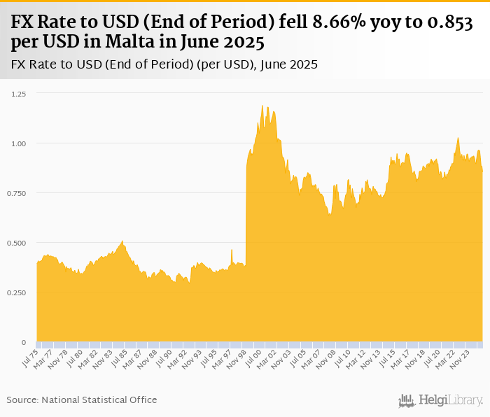 FX rate to USD at the end of period fell 8.66% yoy to 0.853 per USD in Malta in June 2025, according to the National Statistical Office. This is 3.25% less than in the previous month.