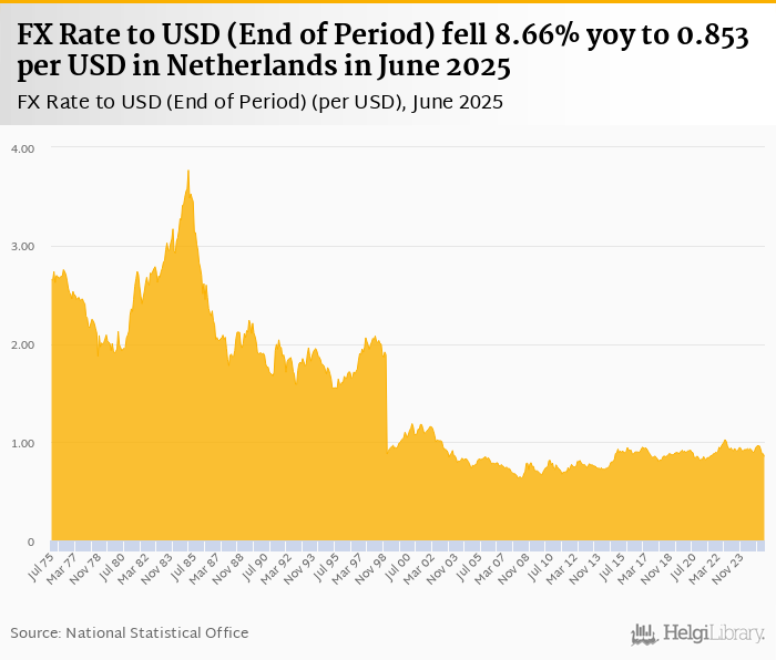 FX rate to USD at the end of period fell 8.66% yoy to 0.853 per USD in Netherlands in June 2025, according to the National Statistical Office. This is 3.25% less than in the previous month.