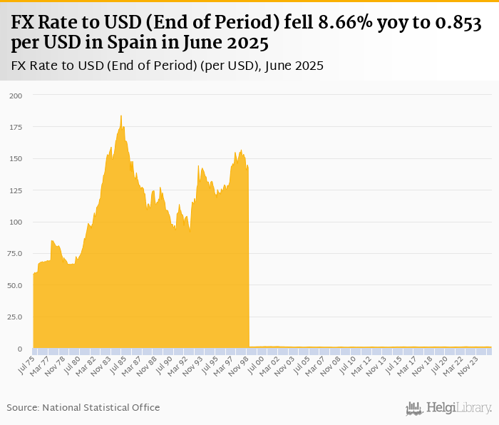 FX rate to USD at the end of period fell 8.66% yoy to 0.853 per USD in Spain in June 2025, according to the National Statistical Office. This is 3.25% less than in the previous month.
