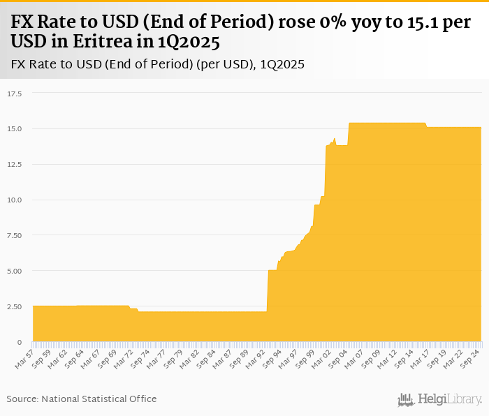 FX Rate to USD (End of Period) rose 0% yoy to 15.1 per USD in Eritrea in 1Q2025