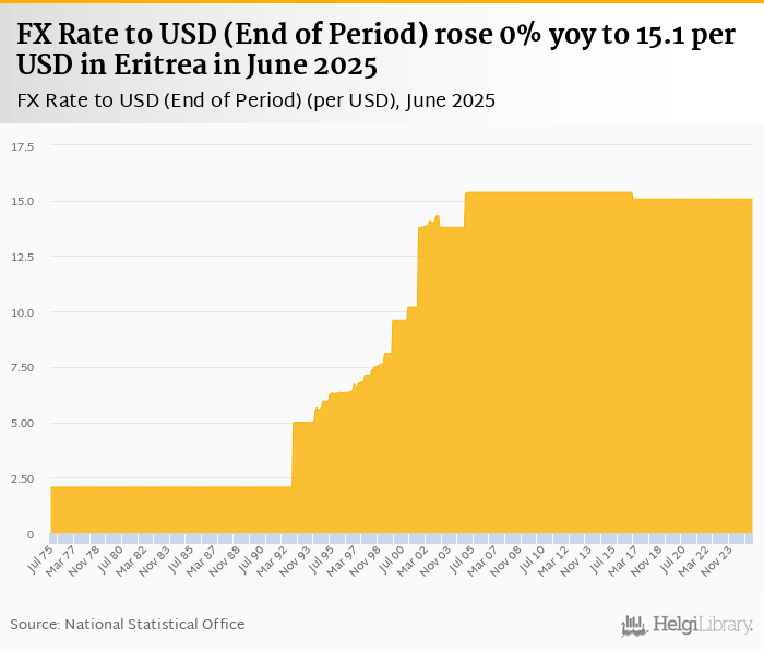 FX rate to USD at the end of period rose 0% yoy to 15.1 per USD in Eritrea in June 2025, according to the National Statistical Office. This is 0% more than in the previous month.