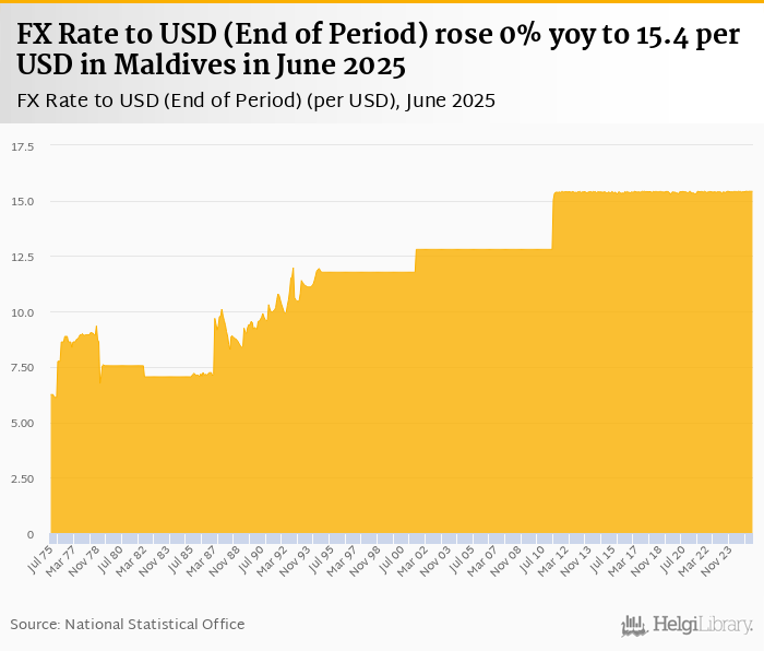 FX rate to USD at the end of period rose 0% yoy to 15.4 per USD in Maldives in June 2025, according to the National Statistical Office. This is 0% more than in the previous month.