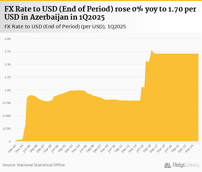 FX rate to USD at the end of period rose 0% yoy to 1.70 per USD in Azerbaijan in 1Q2025, according to the National Statistical Office. This is 0% more than in the previous quarter.