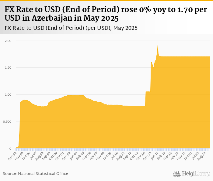 FX rate to USD at the end of period rose 0% yoy to 1.70 per USD in Azerbaijan in May 2025, according to the National Statistical Office. This is 0% more than in the previous month.
