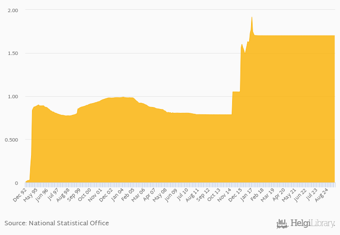 Historically, FX rate to USD at the end of period in Azerbaijan reached an all time high of 1.92 per USD in January 2017 and an all time low of 0.010 per USD in December 1992.