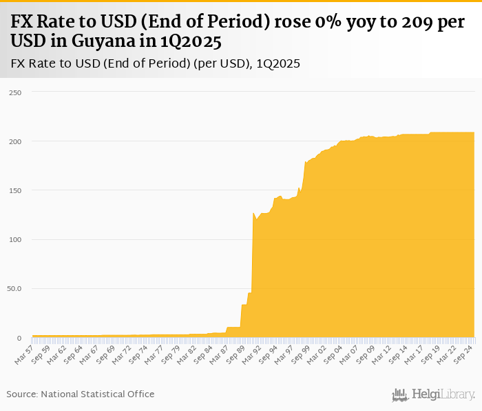 FX rate to USD at the end of period rose 0% yoy to 209 per USD in Guyana in 1Q2025, according to the National Statistical Office. This is 0% more than in the previous quarter.