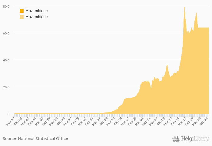 Historically, FX rate to USD at the end of period in Mozambique reached an all time high of 79.1 per USD in 3Q2016 and an all time low of 0.023 per USD in 2Q1973.